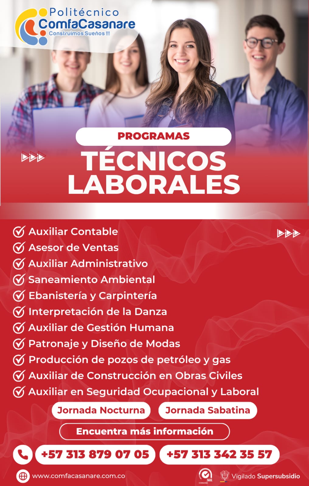Conoce la oferta académica 2026 del Politécnico Comfacasanare en formación técnica, para construir tu futuro. El Politécnico Comfacasanare presenta su oferta académica de programas técnicos para el año 2026, una oportunidad para fortalecer tus competencias y abrir nuevas puertas en el mundo laboral. Con jornadas nocturnas y sabatinas, los interesados contaran con flexibilidad para que puedan acceder a una educación de calidad, alineada con las necesidades del sector productivo y los sueños de superación personal. Entre su amplia oferta académica se encuentran los programas: Preinscríbete en https://site2.q10.com/Preinscripcion?aplentId=166ffcc4-a64c-4be4-af61-4ac6a2b24360 o para ampliar la información, comunícate a los móviles (+57) 3133423557 / (+57) 3138790705