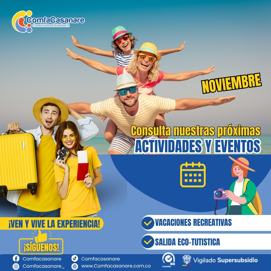 Noviembre llega cargado de bienestar, alegría y aprendizaje con Comfacasanare En Comfacasanare damos la bienvenida a un mes lleno de experiencias diseñadas para disfrutar, compartir y aprender en familia, por eso, durante noviembre, encontrarás una agenda diversa de actividades culturales, recreativas, deportivas y formativas, creadas para fortalecer la integración familiar y el desarrollo personal de nuestros afiliados. Cada espacio ha sido planeado con dedicación y compromiso, pensando en ofrecer momentos significativos que promuevan el bienestar y la unión de la comunidad casanareña. Te invitamos a consultar nuestro cronograma de actividades, participar activamente y disfrutar de todo lo que tenemos preparado para ti. Para más información, visita nuestra página web www.comfacasanare.com.co, síguenos en nuestras redes sociales (Facebook, Instagram y TikTok) o escríbenos al WhatsApp (+57) 3227845981 / (+57) 3219503712. Comfacasanare, creando experiencias que transforman y unen familias.
