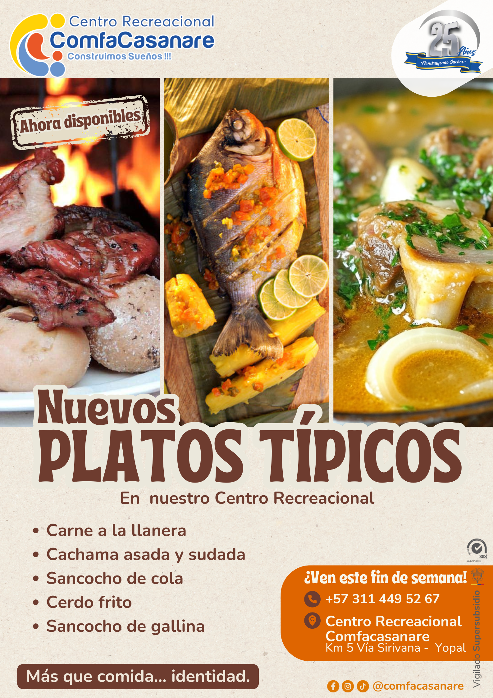 Con sabores que cuentan nuestra historia, llegan los nuevos platos típicos al Centro Recreacional Comfacasanare Comfacasanare sigue construyendo bienestar para los afiliados y sus familias, y ahora también lo hace a través de la gastronomía que encontrarás en el Centro Recreacional (km5 Vía Sirivana – Yopal), con una experiencia culinaria renovada, donde la tradición llanera se sirve en cada plato. Pensando en quienes disfrutan compartir en familia, descansar y vivir nuestras raíces, se ha incorporado una nueva oferta gastronómica basada en preparaciones típicas que exaltan la identidad cultural de la región. Visita este fin de semana el Centro Recreacional Comfacasanare para que compartas con tus seres queridos y disfrutes de un ambiente natural acompañado de los sabores que hacen parte de nuestra cultura. Informes y reservas en el móvil (+57) 3114495267