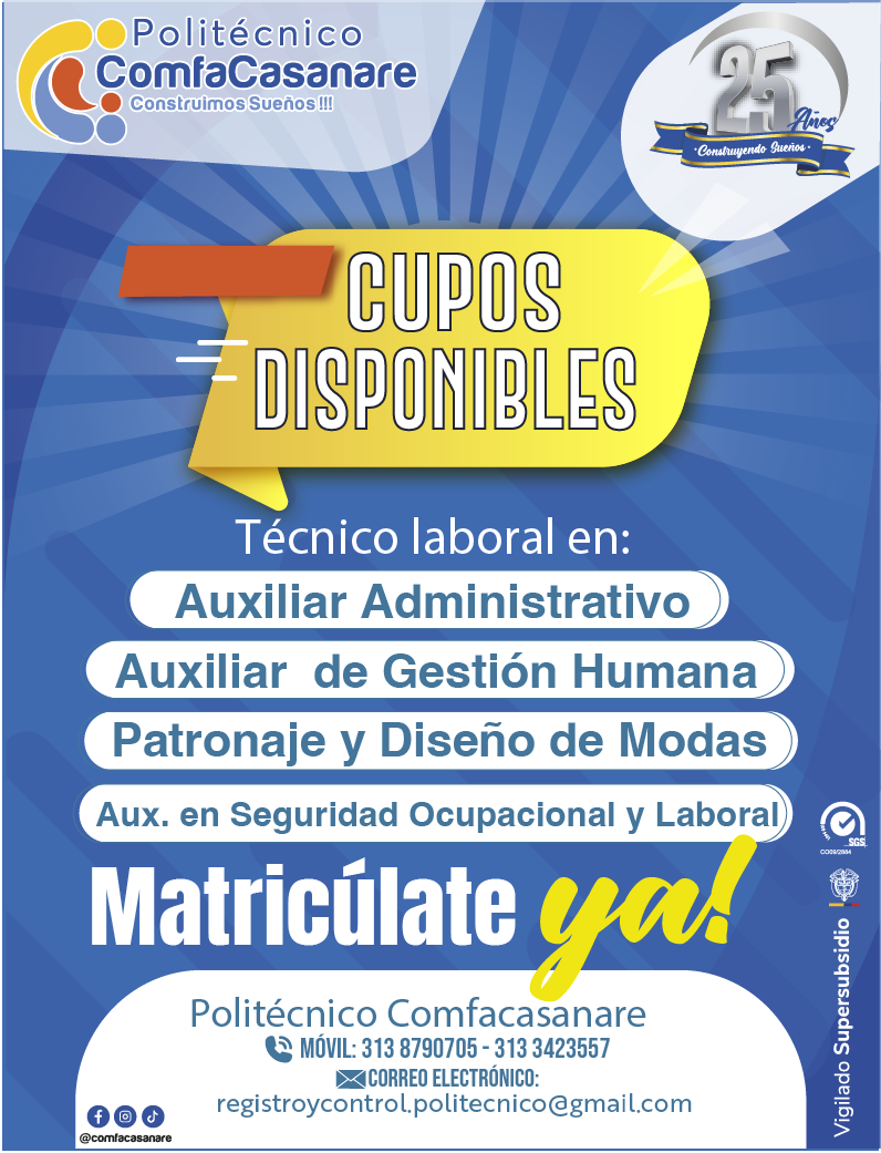 Últimos cupos disponibles para que tu futuro profesional comience hoy, en el Politécnico Comfacasanare El Politécnico Comfacasanare habilita últimos cupos para sus programas de Técnico Laboral, una oportunidad ideal para quienes desean fortalecer sus competencias, mejorar su perfil ocupacional y acceder a nuevas oportunidades laborales, a través de las siguientes áreas de formación: Estos programas están orientados a brindar conocimientos prácticos, actualizados y pertinentes a las necesidades del mercado, permitiendo a los estudiantes desarrollar habilidades técnicas y desempeñarse con mayor competitividad en el entorno laboral. Inscríbete ingresando a https://politecnicocomfacasanare.q10.com/Preinscripcion o comunícate a los móviles (+57) 3138790705 – (+57) 3133423557