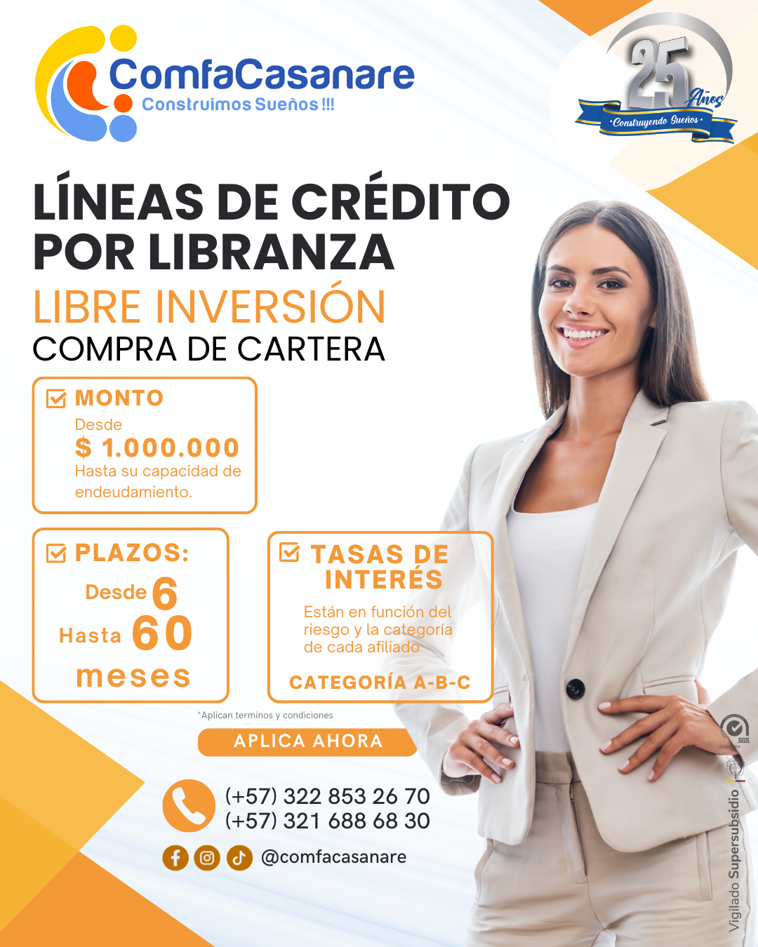 Impulsa tus proyectos con las Líneas de Crédito por Libranza de Comfacasanare. En Comfacasanare trabajamos para brindarte soluciones financieras que se ajusten a tus necesidades y te permitan avanzar con tranquilidad, por eso, podrás disponer de diferentes líneas de crédito por libranza, para ofrecerte respaldo, facilidad de pago y condiciones favorables. A través de las modalidades de Libre Inversión y Compra de Cartera, contaras con la oportunidad de organizar tus finanzas, cumplir metas personales o cubrir imprevistos, con la seguridad y confianza que te ofrece tu Caja de Compensación. Condiciones del crédito Gracias al sistema de descuento por libranza, las cuotas se descuentan directamente de tu nómina, lo que facilita el cumplimiento de tus pagos y te brinda mayor control financiero. Recibe asesoría personalizada: (+57) 3228532670 / (+57) 3216886830. Aplican términos y condiciones.