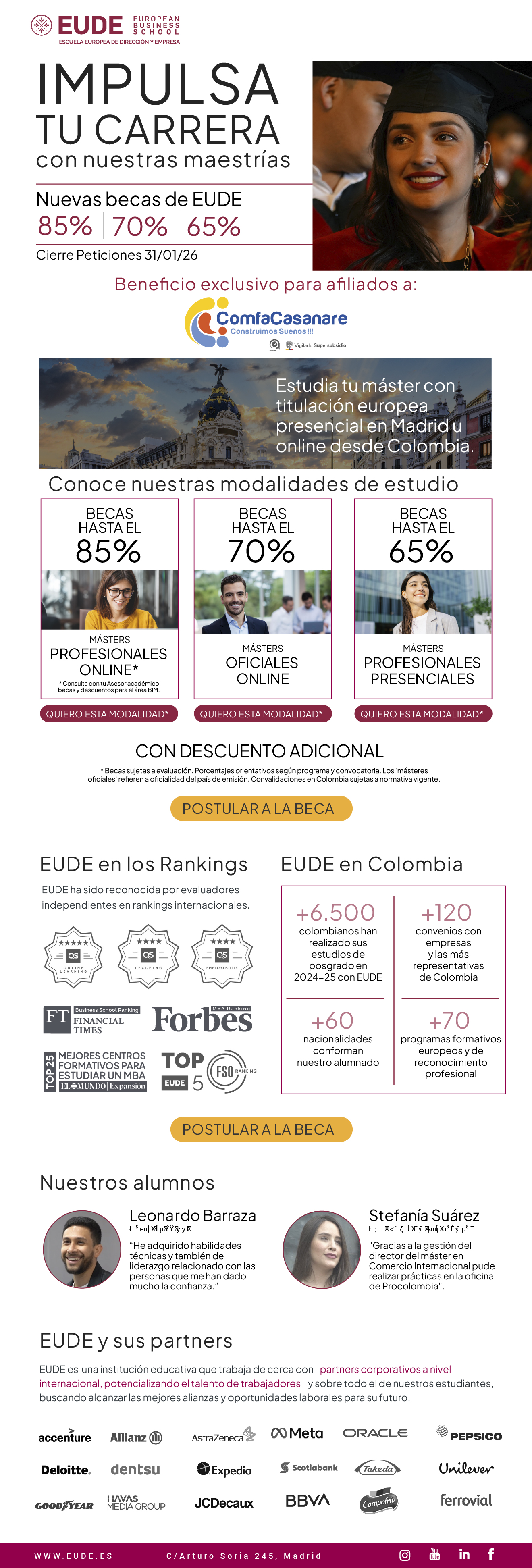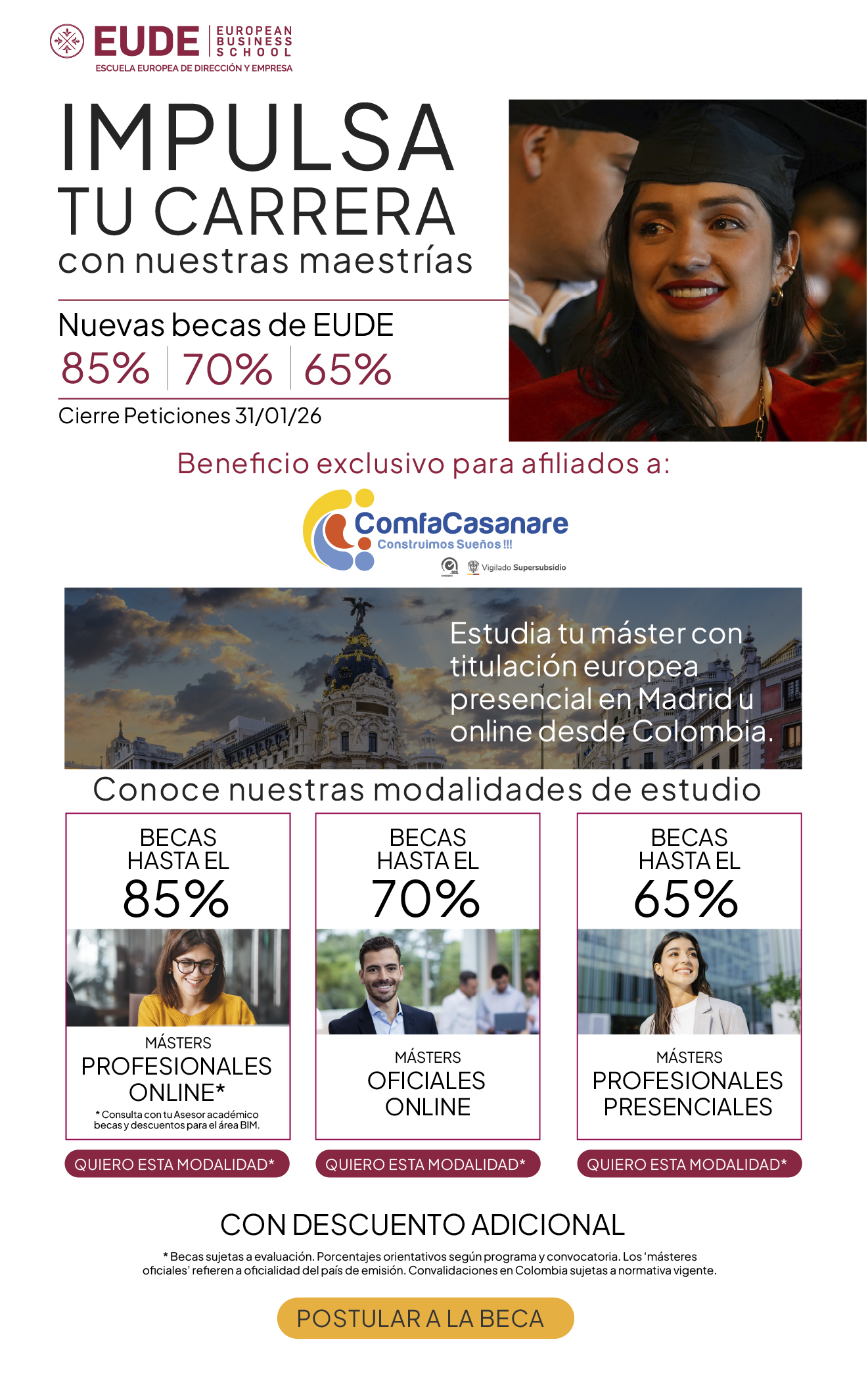 A través del convenio con EUDE – European Business School, los afiliados a Comfacasanare pueden acceder a maestrías con titulación europea, con becas de hasta el 85 %, fortaleciendo su proyección profesional a nivel internacional; este beneficio exclusivo permite estudiar máster profesional y oficial, en modalidad online desde Colombia o presencial en Madrid, en áreas estratégicas para el desarrollo laboral y empresarial, ampliando las oportunidades de crecimiento académico y personal.