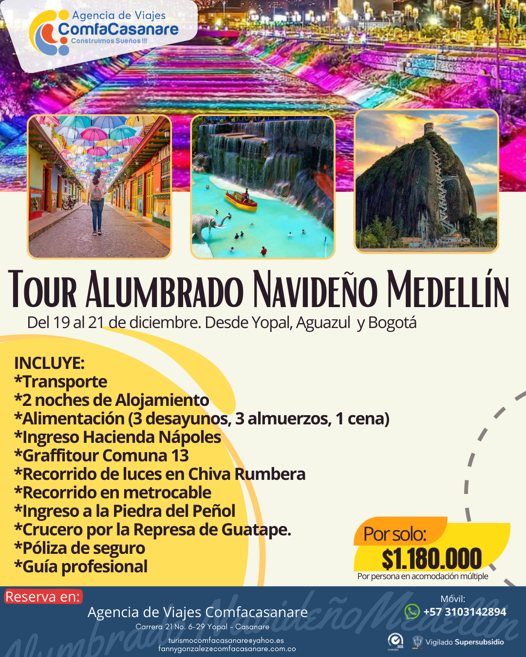 Comfacasanare continúa creando experiencias inolvidables para sus afiliados, promoviendo el bienestar, la integración familiar y el disfrute cultural, en esta temporada decembrina, te invitamos a disfrutar de una travesía única por Medellín, Guatapé, la Piedra del Peñol y la Hacienda Nápoles, un recorrido lleno de color, historia y diversión, por $1.180.000 adulto y $1.095.000 niños entre los 4 a 8 años de edad en acomodación múltiple.