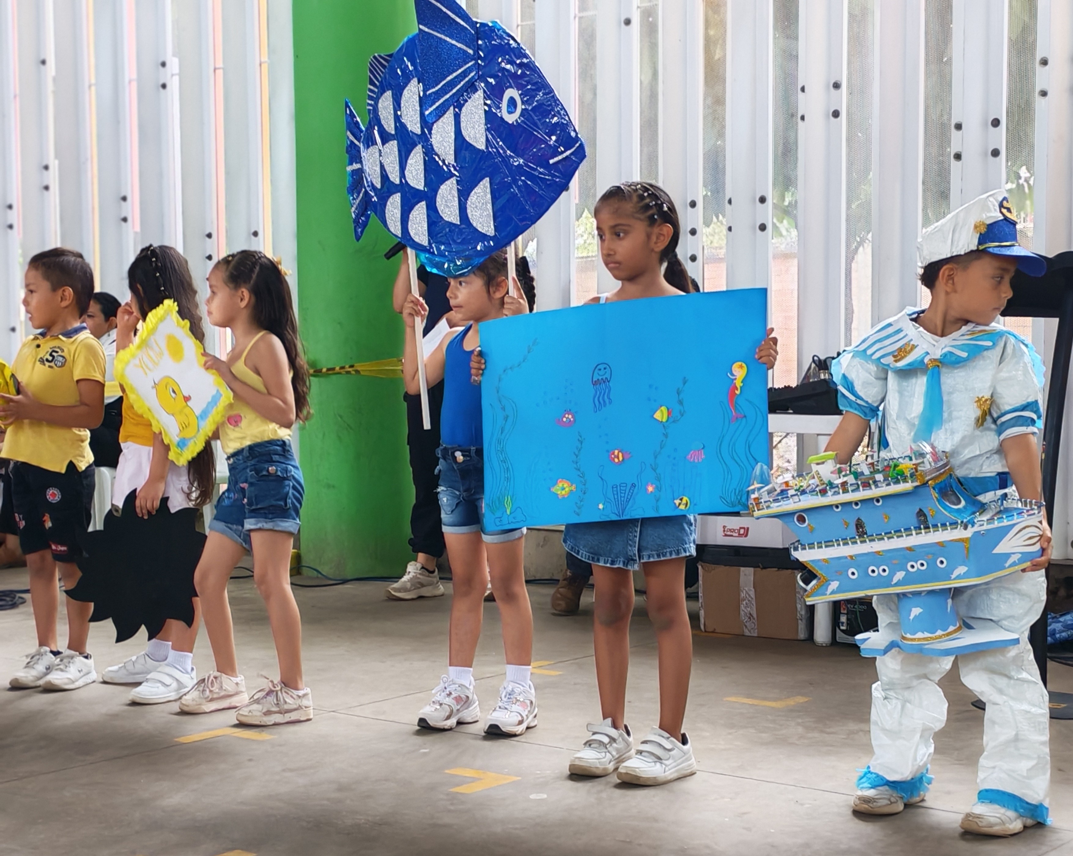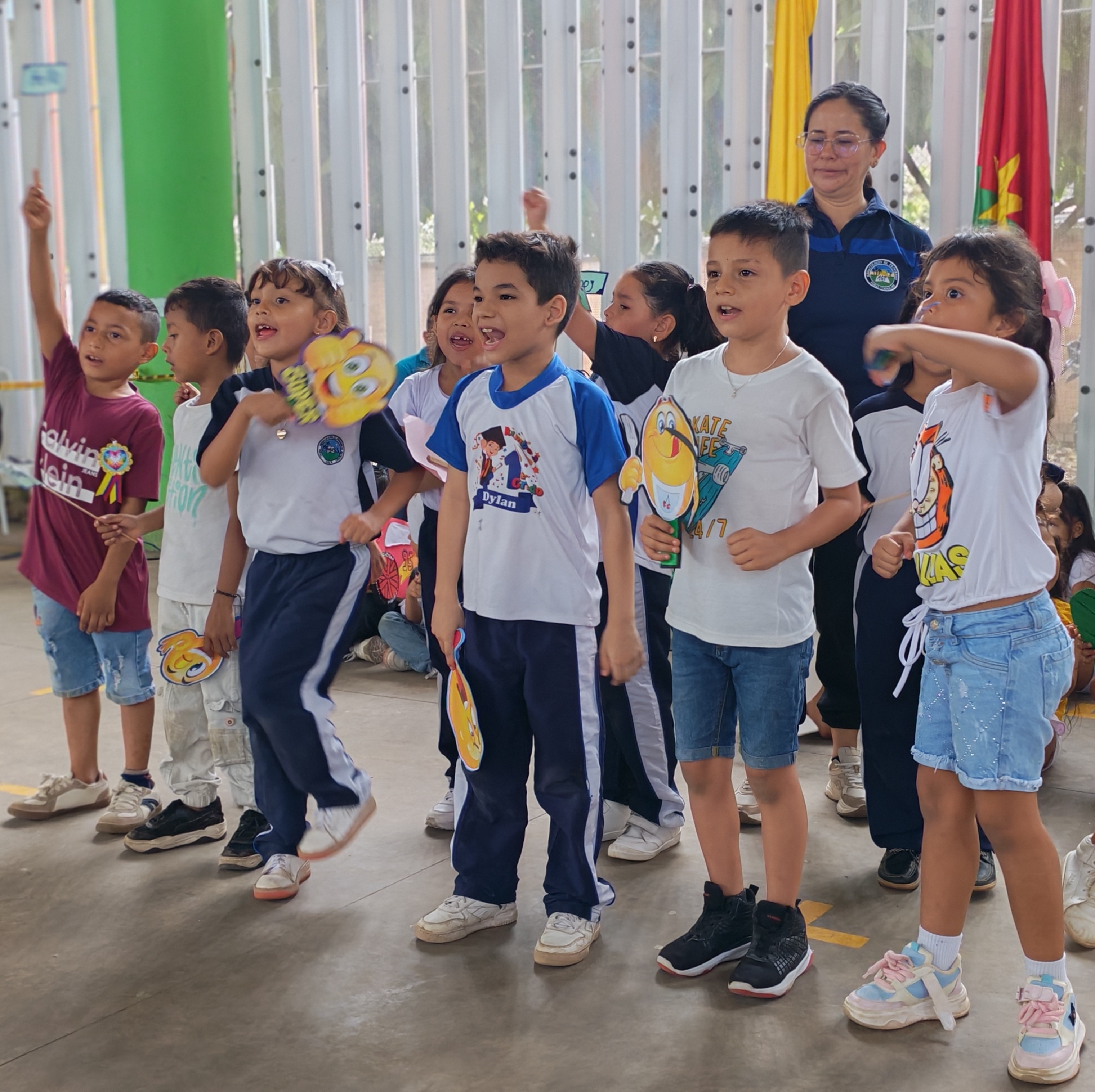 Durante la actividad, los niños y niñas realizaron una destacada presentación artística en la que interpretaron una canción en inglés, representando los colores a través de diversos objetos. Esta estrategia pedagógica facilita la recordación, la comprensión y el aprendizaje significativo del segundo idioma.