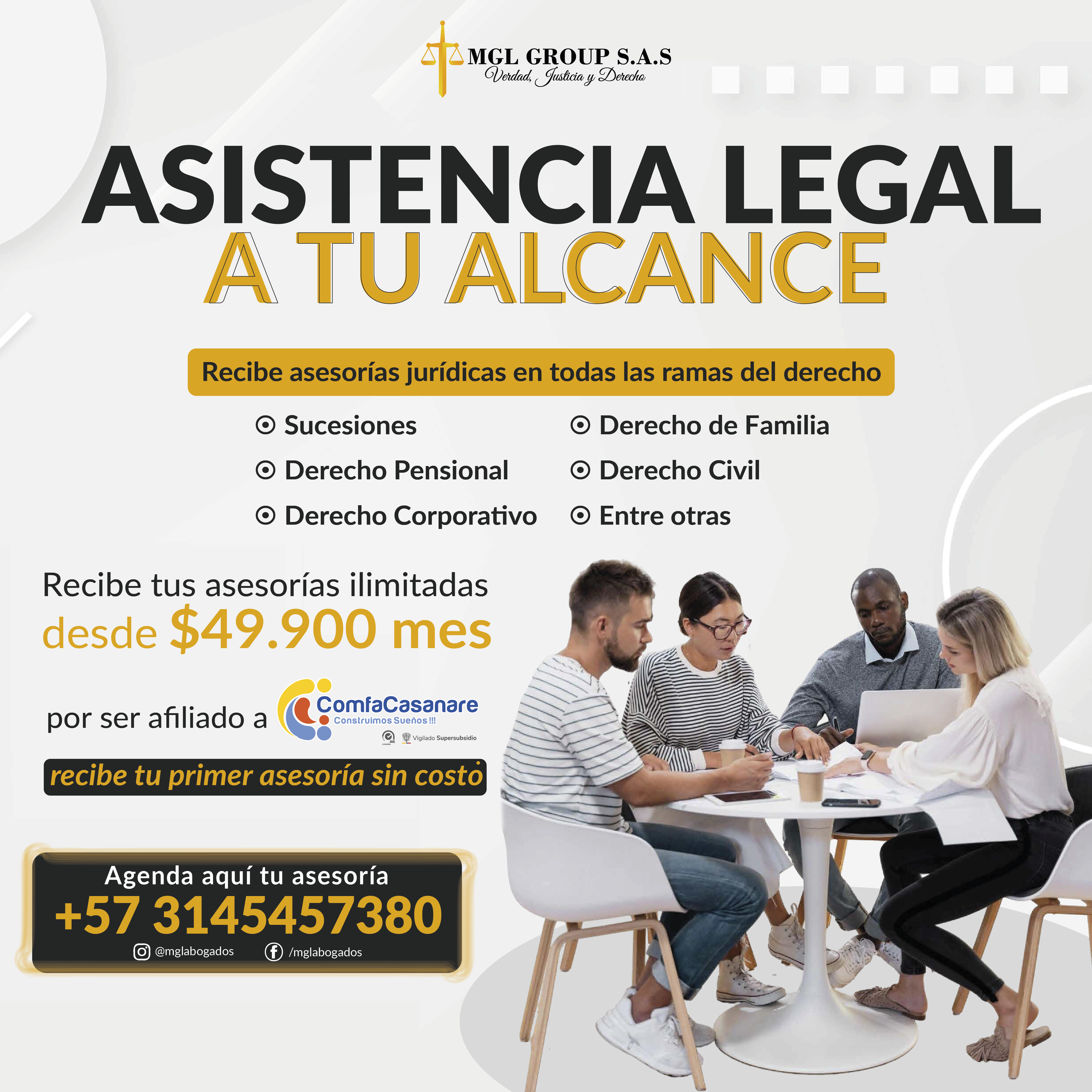 En Comfacasanare seguimos trabajando para que nuestros afiliados y sus familias cuenten con más beneficios que impacten positivamente su bienestar y calidad de vida, por eso, mediante la alianza con MGL Group S.A.S., ahora los afiliados podrán acceder a asesorías jurídicas ilimitadas en todas las ramas del derecho, incluyendo sucesiones, derecho de familia, derecho civil, pensional y corporativo, entre otros.