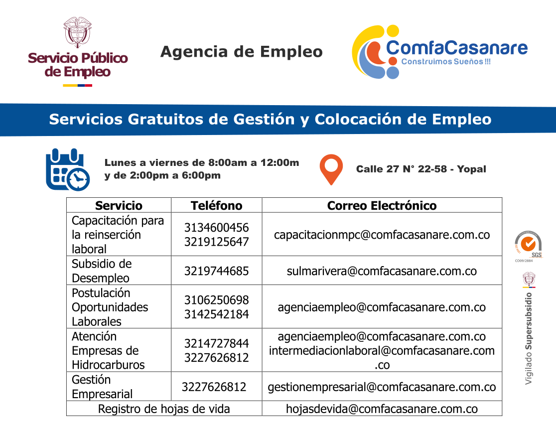 - Atención empresas módulo hidrocarburos Correo: agenciaempleo@comfacasanare.com.co Móvil: 3214727844