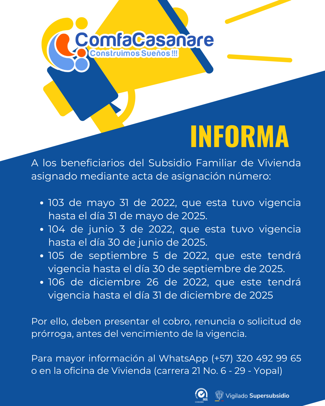 El subsidio de vivienda es un aporte en dinero que Comfacasanare otorga por disposición legal a sus afiliados, con el fin de facilitarles la adquisición de una solución de vivienda nueva, por una sola vez y sin que el beneficiario lo deba restituir, siempre y cuando cumpla con los requisitos de ley como complemento de su ahorro programado.