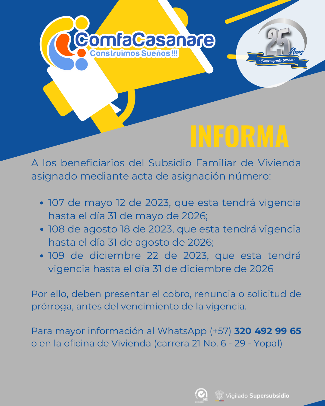 Es un aporte en dinero que otorga COMFACASANARE a sus afiliados por una sola vez, que constituye un complemento para facilitar la adquisición de una vivienda nueva, la construcción de una vivienda en sitio propio o el mejoramiento de una vivienda de interés social de su propiedad.