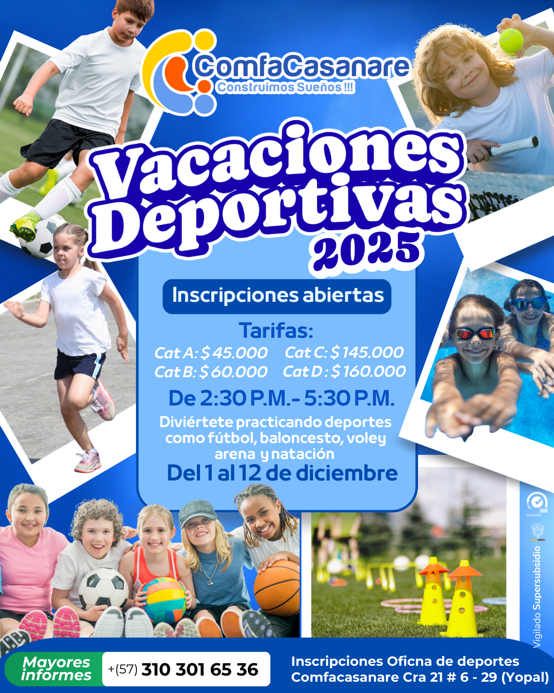 Mayores informes e inscripciones, comunícate al (+57) 3103016536 o acércate al área de Deportes, en la sede administrativa Comfacasanare (carrera 21 # 6 – 29, Yopal)